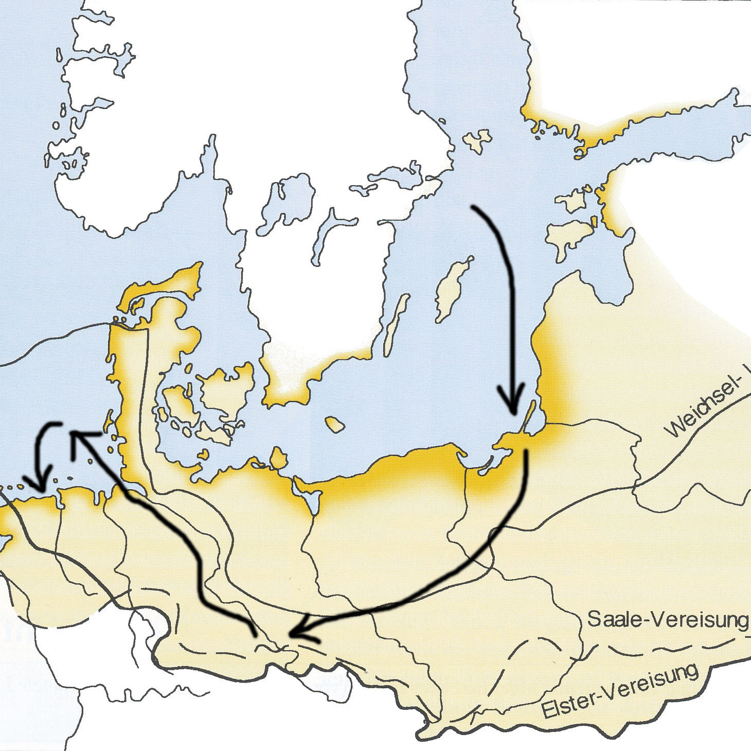 An der Nordsee angespülter Bernstein ist im Lauf der Jahrmillionen bis zu fünf mal umgelagert worden. Die Flüsse im Bernsteinwald flossen südwärts und lagerten ihn in der "Blauen Erde" Litauens ab. Während der Eiszeiten hobelten die von Skandinavien kommenden Gletscher den Untergrund ab und schoben Teile der Bernsteinlagerstätte im Geröll vor sich her bis nach Mitteldeutschland. Deshalb findet man Bernstein heute auch in Berlin beim U-Bahnbau. Beim Abschmelzen der Gletscher spülte das Schmelzwasser den oberflächennah liegenden Bernstein gen Norden in die Nordsee. Hier lagerte sich am Meeresgrund erneut ab. Besonders der Basistorf der Nordsee, der unmittelbar nach der Eiszeit entstanden ist, enthält recht viel Bernstein. Wird der Bernstein aus diesem Basistorf durch Nordseeströmungen freigespült, kann er an den Strand gelangen und von glücklichen Strandläufern gefunden werden.