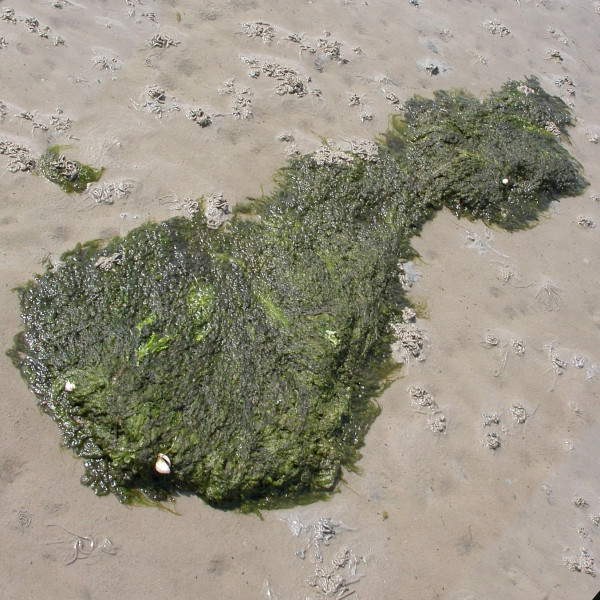 Grüne Watte, verfilzt, dünnfädig weich, im Watt