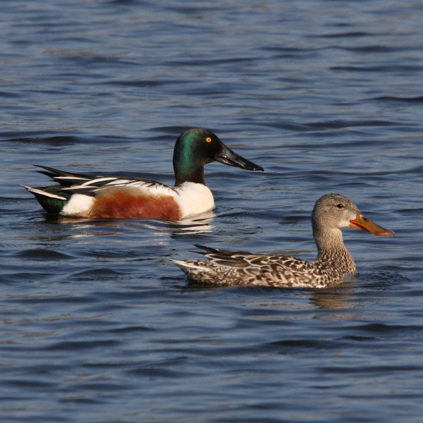 Mittel, Schnabel sehr breit, Erpel weiß-schwarz-rostbraun-blau