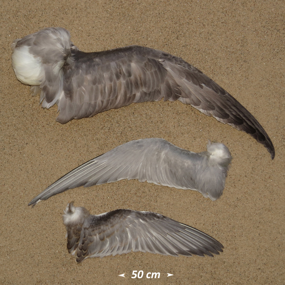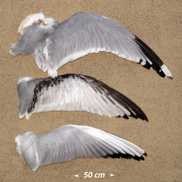 Flügel schlank und spitz, weiß-grau, Spitzen dunkler grau
