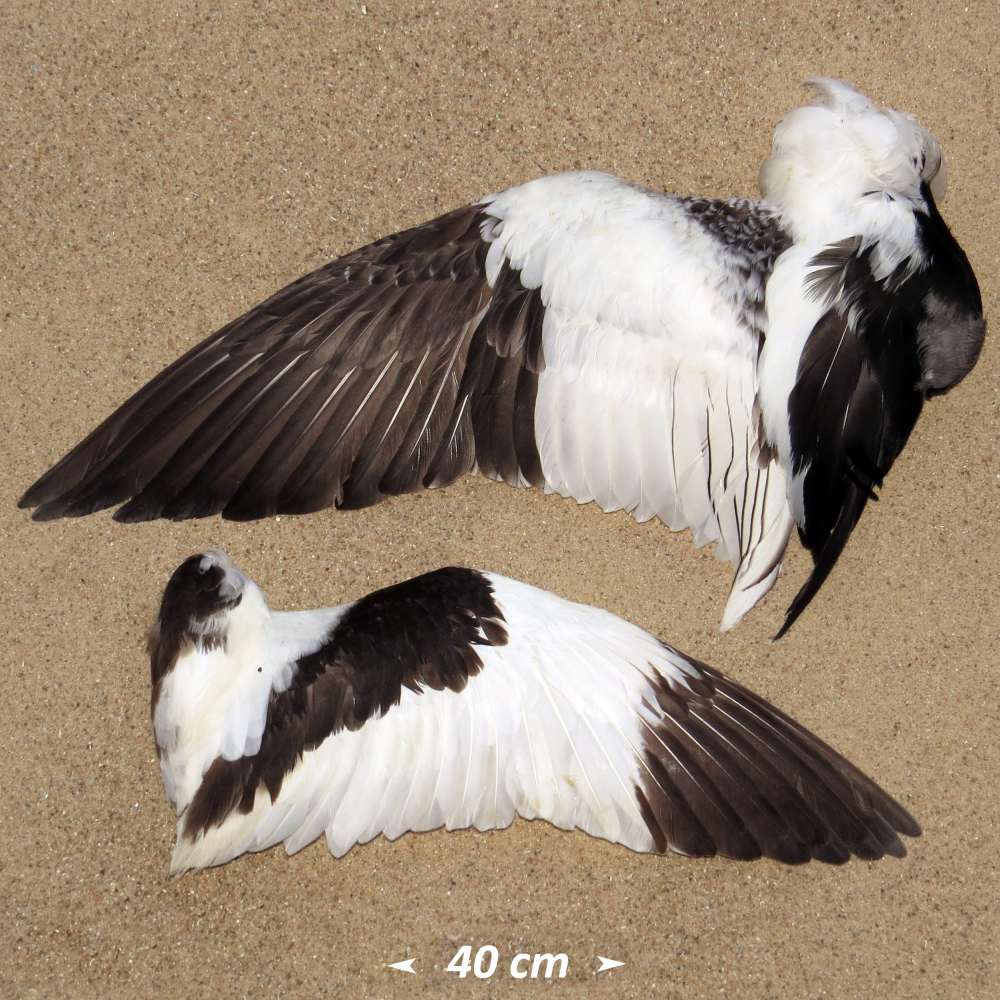 Flügel weiß-grau, Spitzen schwarz, manchmal oberseits gemustert