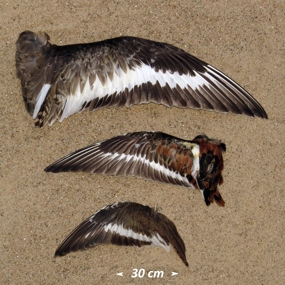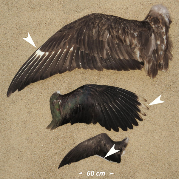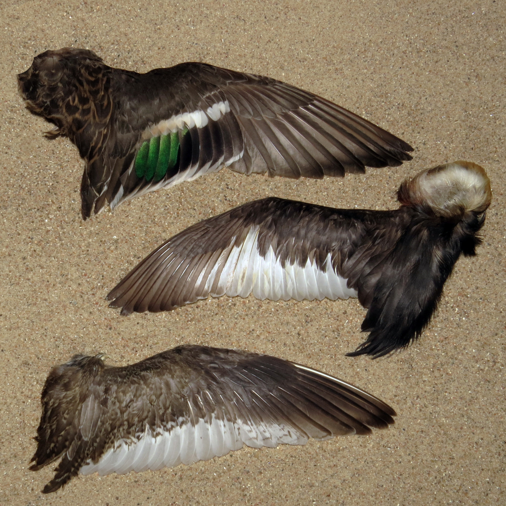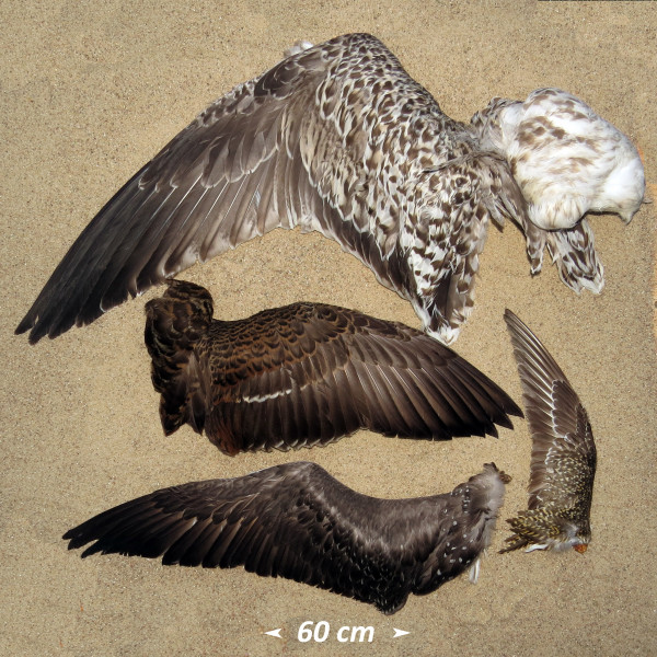 Flügel grau/braun, Federränder und Federkiele weiß(lich)