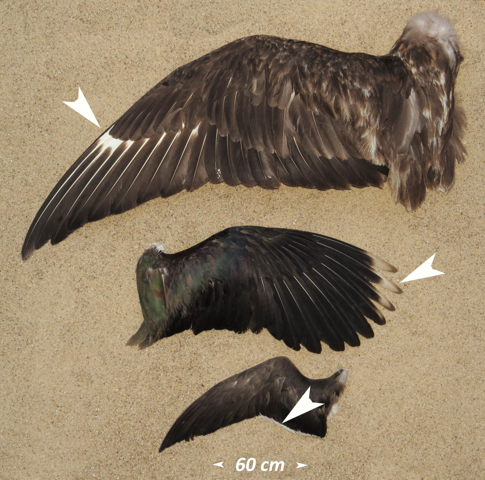 Ansatz der äußeren Handschwingen weißlich, Flügeloberseite grau oder braun