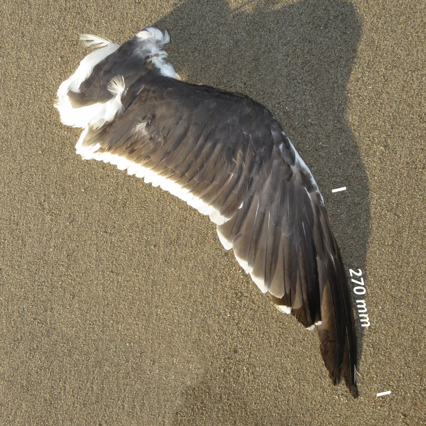 Dunkelgrau, äußere Fahnen schwarz, weiße Spitzenflecken, Kiele schwarz