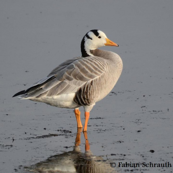 Hellgrau und weiß, Füße gelb, Querstreifen am Hinterkopf