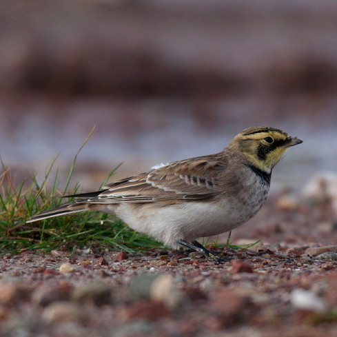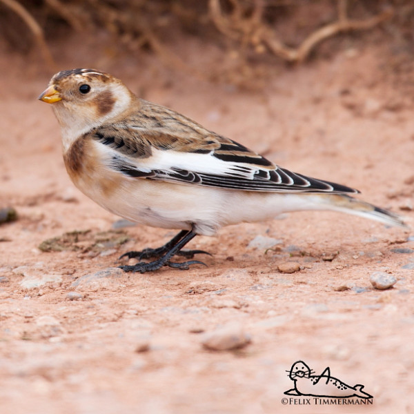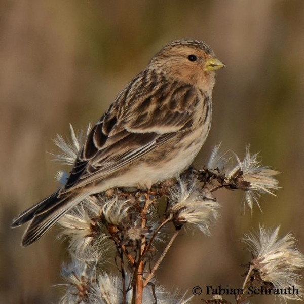 Klein, braun gescheckt, Schnabel gelblich; Schwarmvogel im Winter