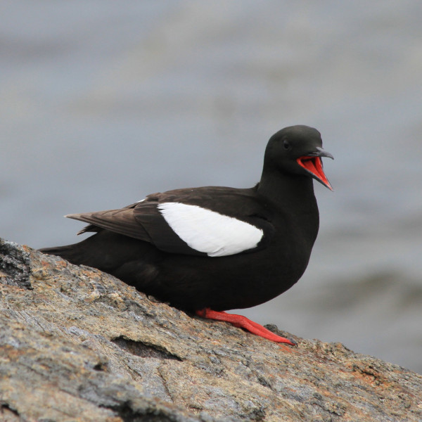 Schnabel spitz, Füße rot, Gefieder schwarz mit etwas weiß
