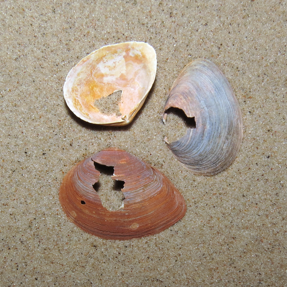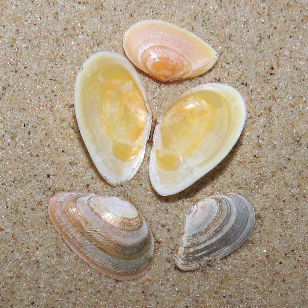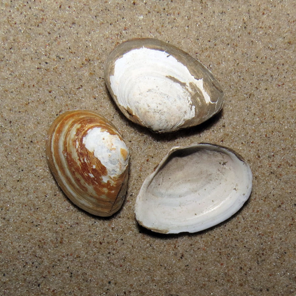 Sehr flach und dünn, länglich eiförmig, rechte Klappe gestreift