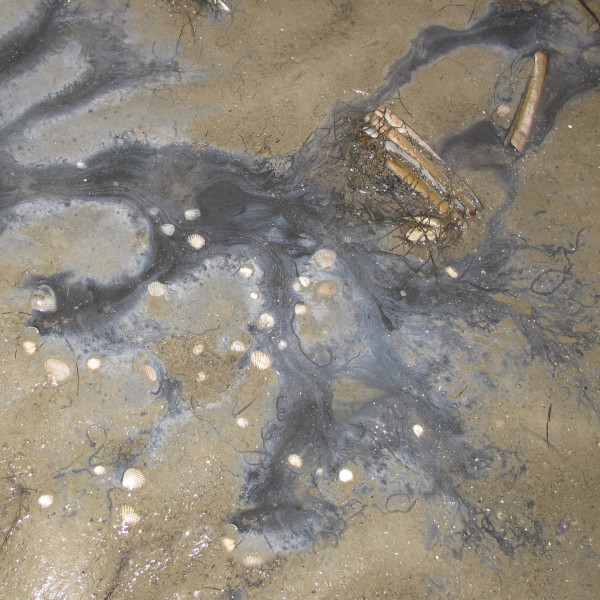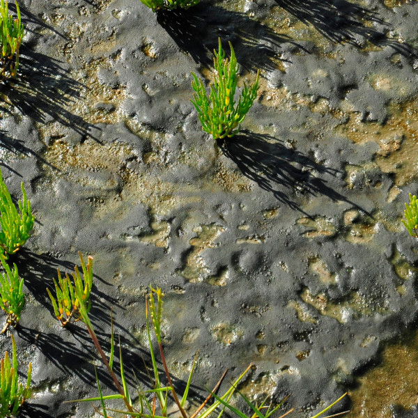 Schwärzlicher Film im Quellerwatt, sehr glitschig
