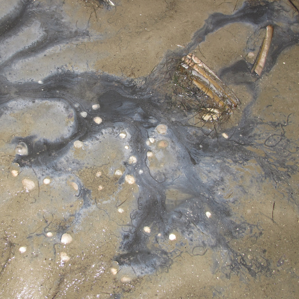 Schwarz-graue Flecken im Watt, teils Gasgeblubber