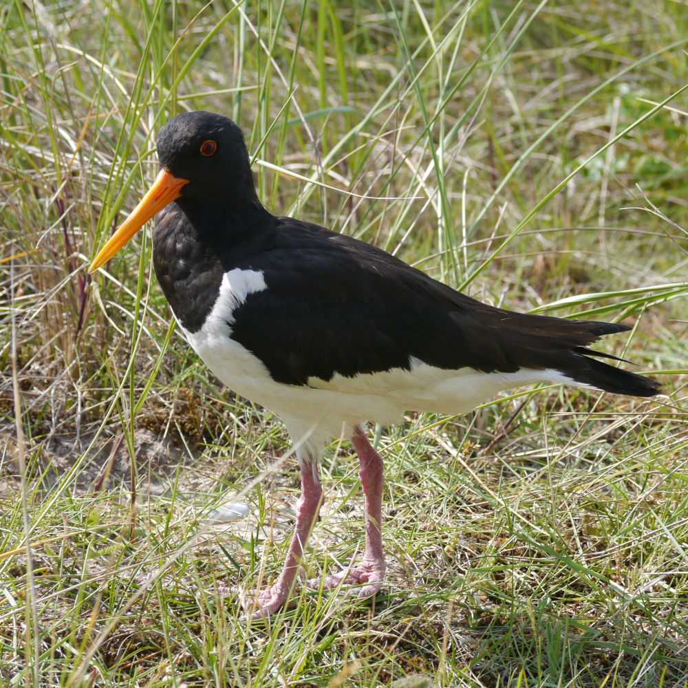 Gefieder schwarz-weiß, Beine und Schnabel lang