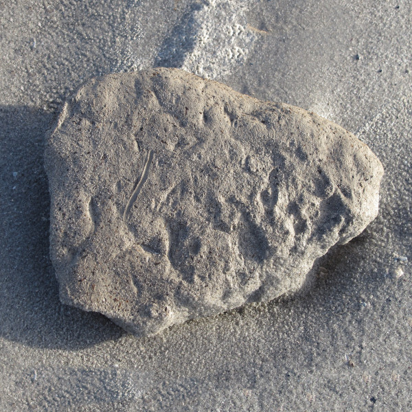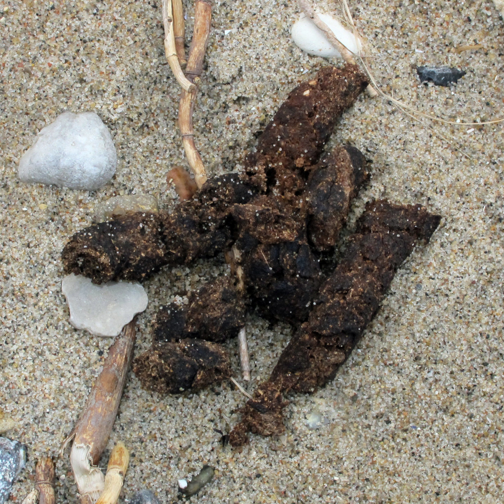 Schwarzbraun, zerbröselbar, geruchlos, oft mit Löchern