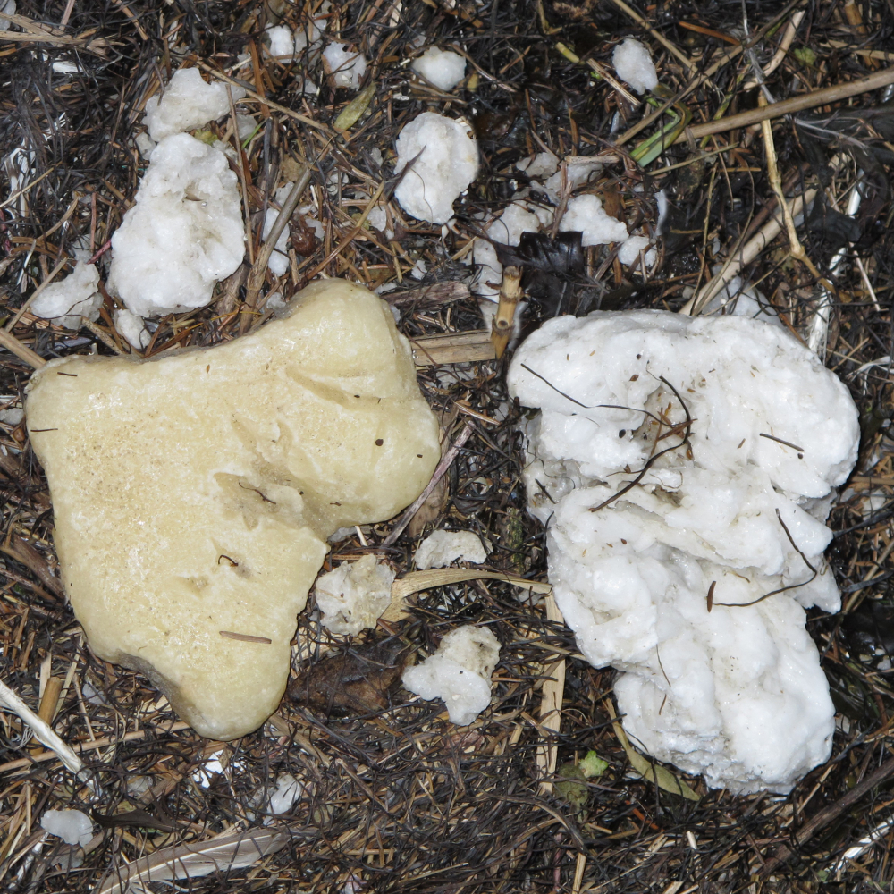 Weiß bis gelbbraun, weich bröselig, chemisch riechend