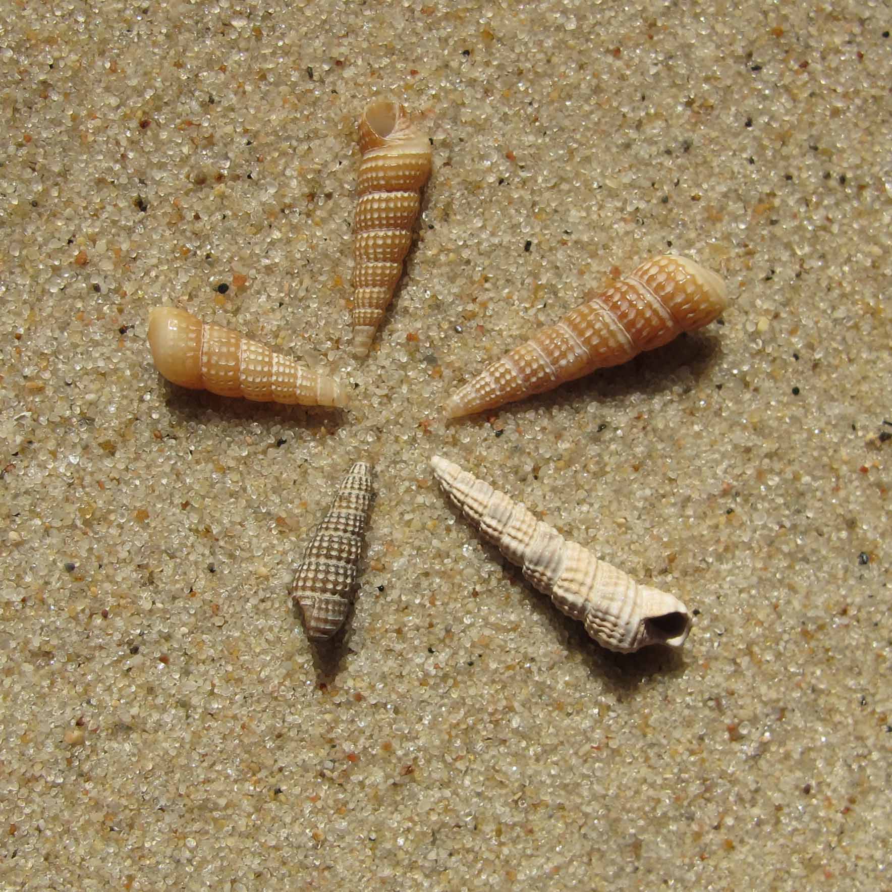 Sehr schlankes spitzes Gehäuse, starke Querrillen und Längsrippen, viele kleine „Knötchen“ (Tuberkel), hellbraun